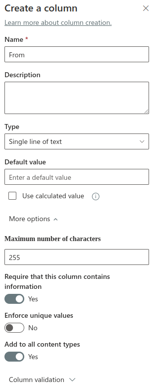 The list gets created containing only the Title column. We are going to add the more columns, to hold the From-Address, the Review-Text (Body) and the score.