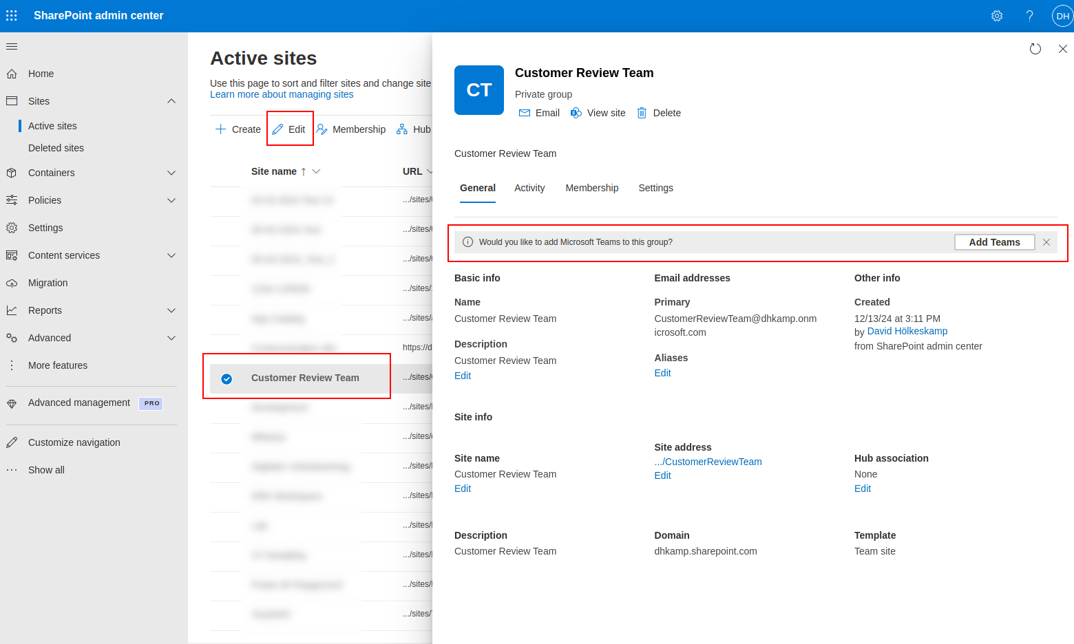 After our teamsite has been created, open its settings and click on the Add Teams-Button in the banner that says