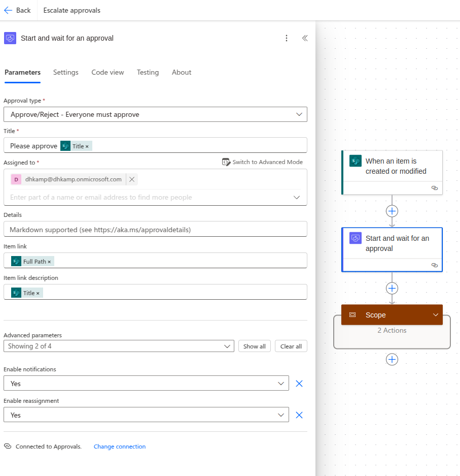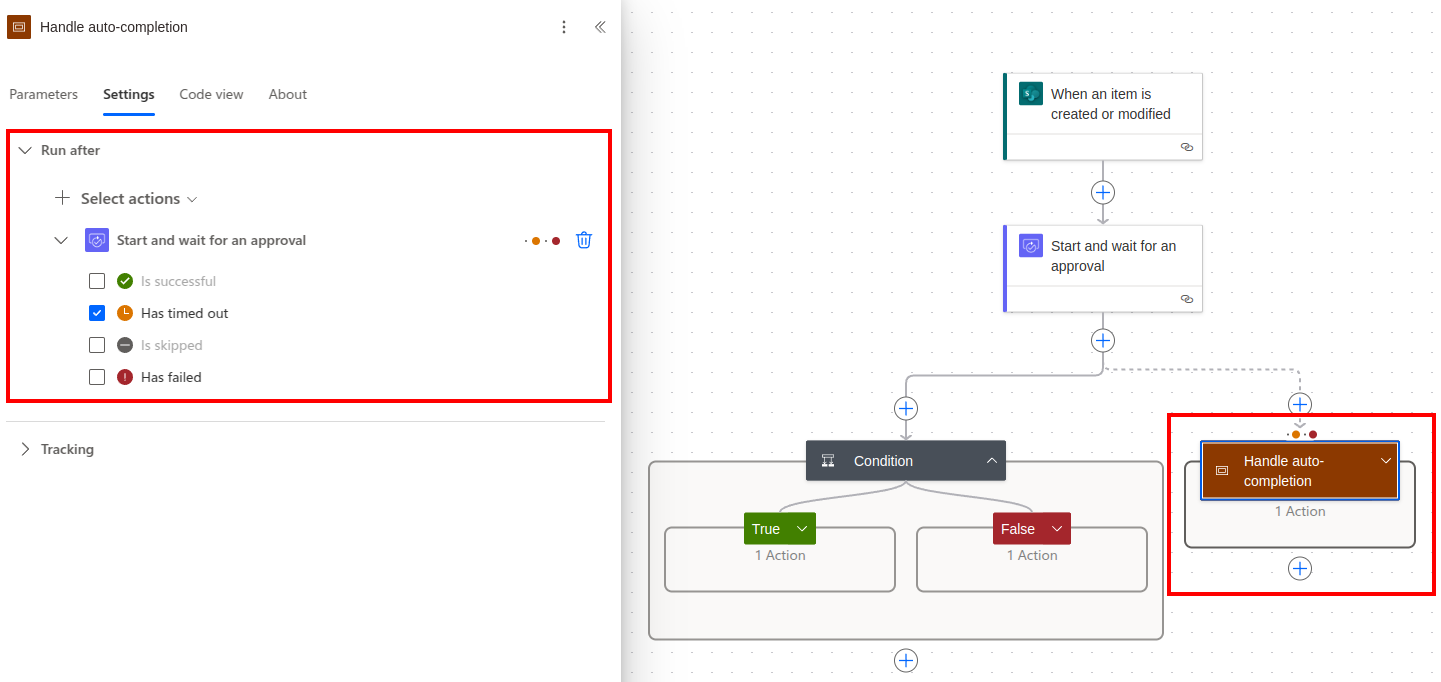 Now add the Start and wati for an approval action and set the selected state to Has timed out-