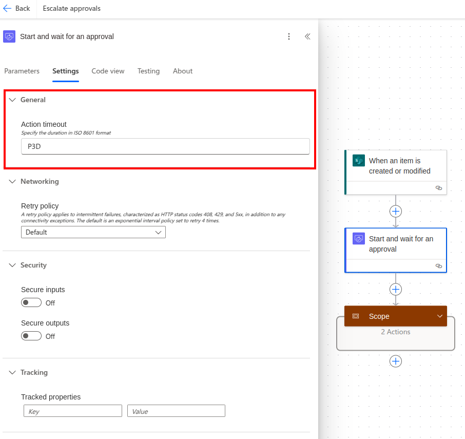 Next, define the timeout duration – the time the approval should wait before continuing the flow execution.