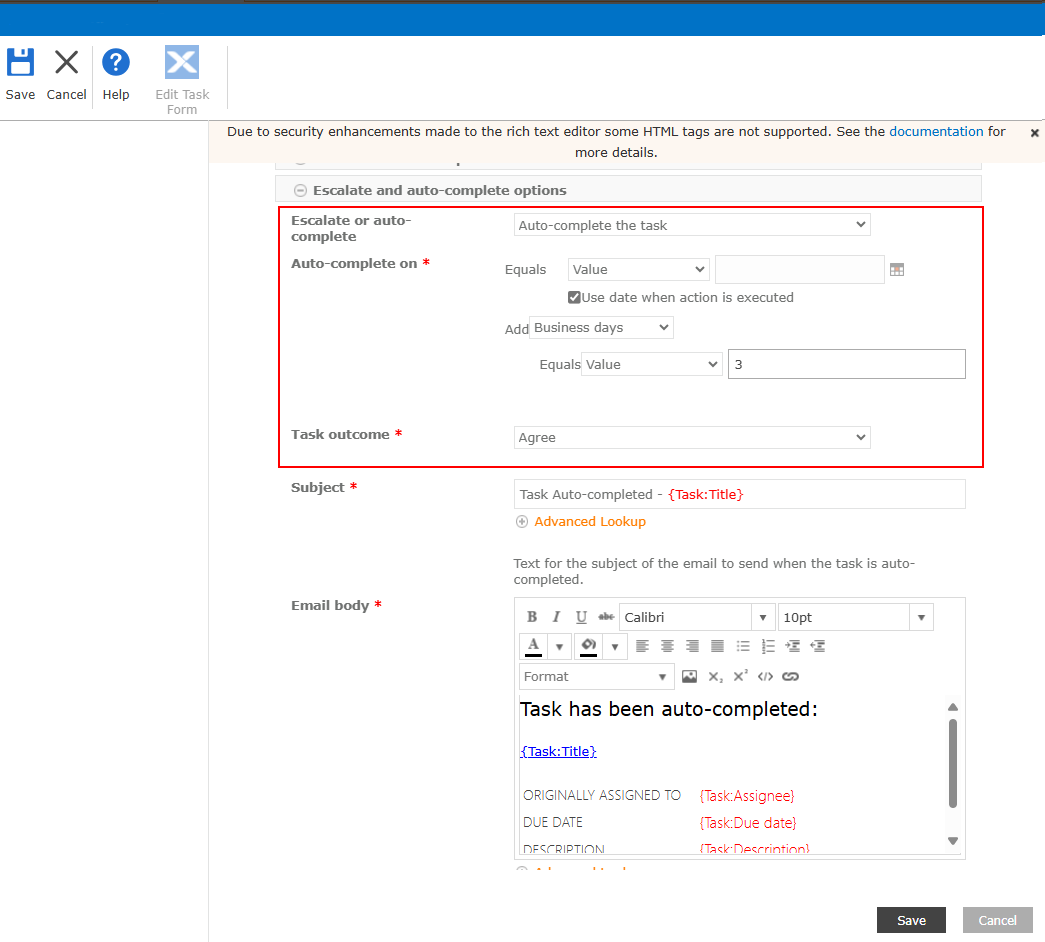 To set the action to wait three days before automatically concluding, enter P3D, which means ‘Period of three days’